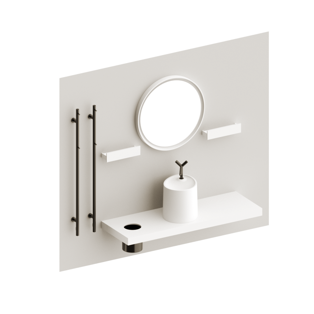 Eumar Ovo kylpyhuonekalustesetti 3 sisältää kaiken tämän: pesuallas kannattimineen ja vesilukko pop-up venttiilillä, peili Tondo 80 mattavalkoisella reunuksella halkaisija 80 cm , pyyhekuivain, alataso roskakorilla.